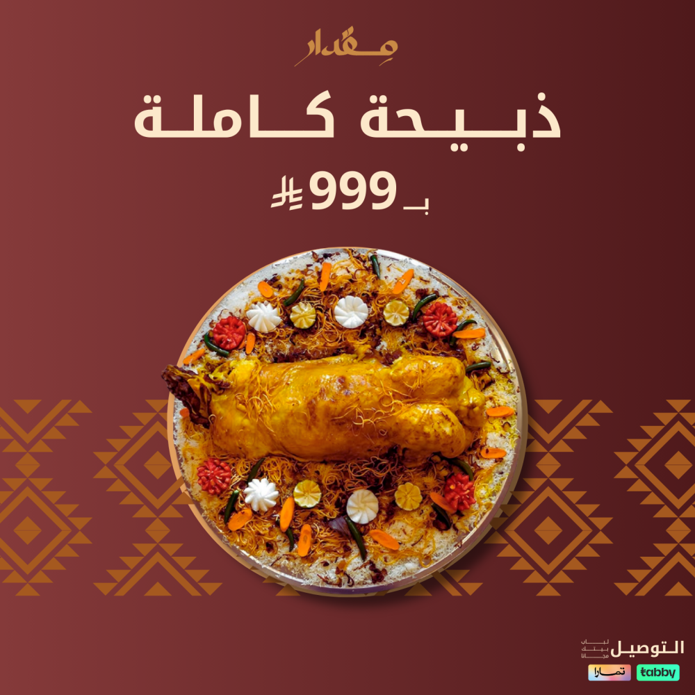 استمتعوا بتجربة طعام فاخرة مع ذبيحة كاملة من “مقدار”، محضّرة بعناية ومقدّمة بأسلوب مميز على صحن أو صحنين، تكفي بسخاء من 15 إلى 18 شخصًا. الخيار الأمثل لمناسباتكم واجتماعاتكم لتجربة لا تُنسى